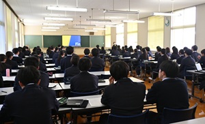 - 11月13日(木)午後、長崎県立大学国際社会学部国際社会学科 釘島正智特任教授を講師としてお招きし、文理探究科3年生の生徒を対象に特別講義を行いました。